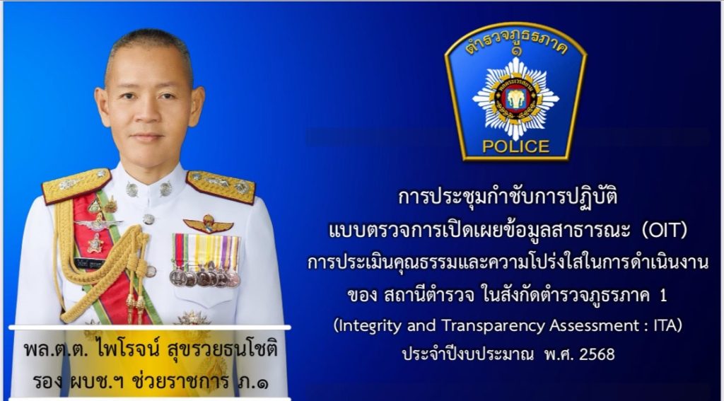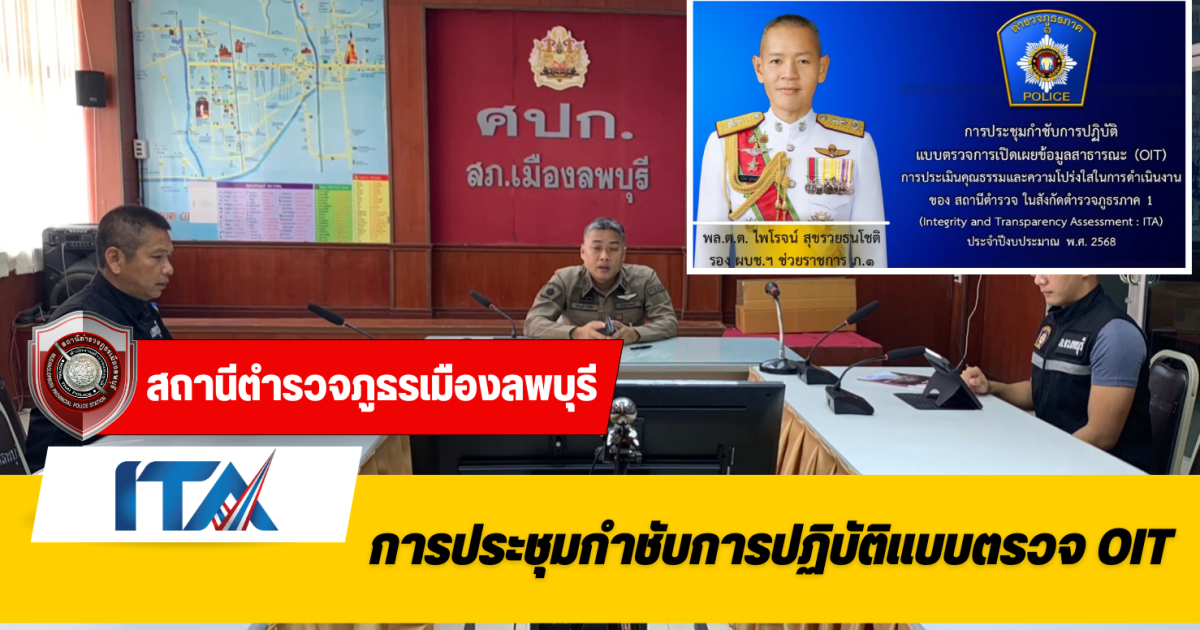 การประชุมกำชับการปฏิบัติแบบตรวจ OIT 11 เมษายน 2568 โดย admin / การมีส่วนร่วมของหัวหน้าสถานีตำรวจ,ข่าวภารกิจผู้บังคับบัญชา ในวันที่ 11 เมษายน 2568 เวลา 13.30 น. พ.ต.อ.จรินทร์ ลำลึก ผกก.สภ.เมืองลพบุรี, พ.ต.ท.วินัย แจ่มอำพร สว.อก.สภ.เมืองลพบุรี และ ส.ต.อ.ศุภกฤต แสงทอง ผบ.หมู่ (ป.) สภ.เมืองลพบุรี เข้าร่วมประชุม ของตำรวจภูธรภาค 1 เรื่อง การติดตามการดำเนินการประเมินคุณธรรมและความโปร่งใสในการดำเนินงานหน่วยงานภาครัฐ (ITA) ของสถานีตำรวจ ประจำปีงบประมาณงบประมาณ พ.ศ.2568