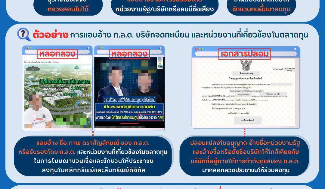 แอบอ้าง ชื่อ ภาพ ตราสัญลักษณ์ ของ ก.ล.ต. หรือรับรองโดย ก.ล.ต. และหน่วยงานที่เกี่ยวข้องในตลาดทุนในการโฆษณาชวนเชื่อและชักชวนให้ประชาชนลงทุนในหลักทรัพย์และสินทรัพย์ดิจิทัล