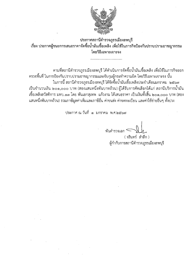 ประกาศจัดซื้อจัดจ้าง เดือนมกราคม 2567 15 มกราคม 2567 โดย admin / ข่าวจัดซื้อจัดจ้าง,ข่าวจัดซื้อจัดจ้าง,งานงบประมาณแผนงาน ประกาศ สภ.เมืองลพบุรี เรื่อง ประกาศผู้ชนะการเสนอราคาจัดซื้อน้ำมันเชื้อเพลิง โดยวิธีเฉพาะเจาะจงเดือน ม.ค.67 ไฟล์ PDF คลิกที่นี่