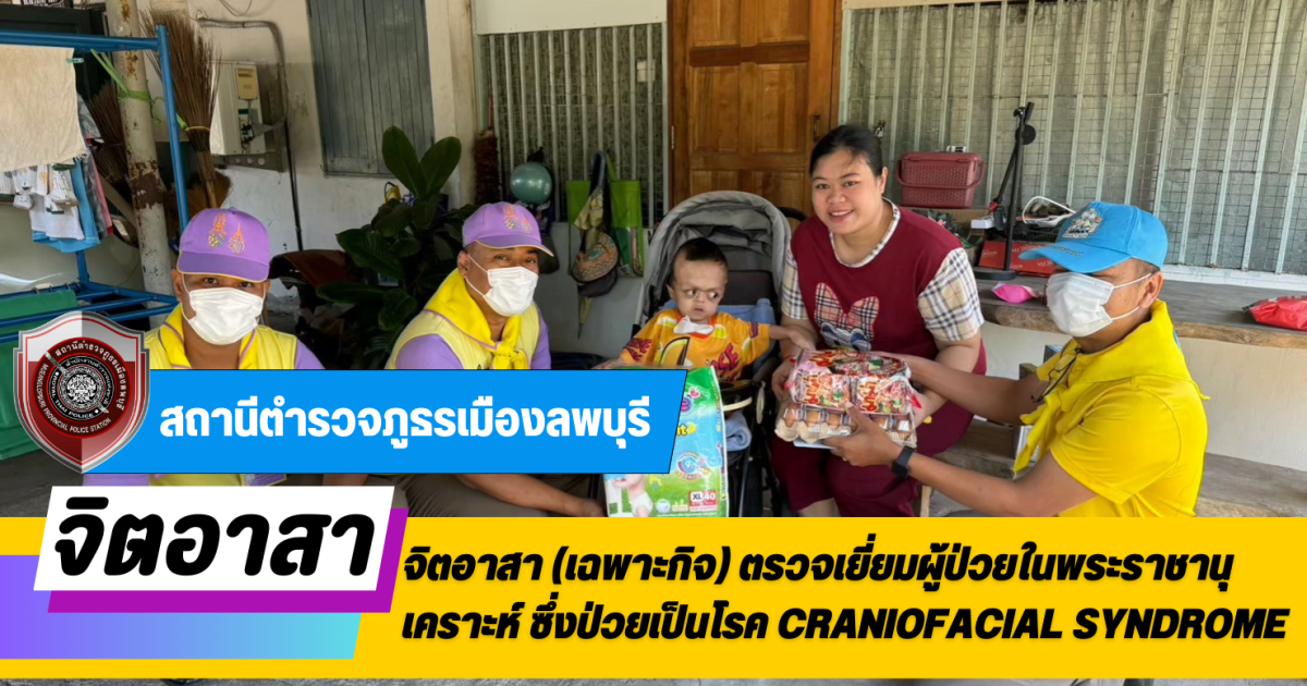 พ.ต.อ.จรินทร์ ลำลึก ผกก.สภ.เมืองลพบุรี ,พ.ต.ท.วินัย แจ่มอำพร สว.อก.สภ.เมืองลพบุรี ,ร.ต.อ.พชรพล แจ่มใส รอง สว.(สอบสวน)สภ.เมืองลพบุรี พร้อมข้าราชการตำรวจจิตอาสา สภ.เมืองลพบุรี ได้ตรวจเยี่ยมผู้ป่วยในพระราชานุเคราะห์ ด.ช.พุทธิพันธ์ โพธิ์สุวรรณ อยู่บ้านเลขที่ 130/812 หมู่ 3 ซอย 4/6 ต.ทะเลชุบศร อ.เมืองลพบุรี จ.ลพบุรี ซึ่งป่วยเป็นโรค Craniofacial syndrome ซึ่งอยู่บริเวณเรือนรับรองที่ประทับหน่วยบัญชาการสงครามพิเศษ ค่ายสมเด็จพระนารายณ์มหาราช