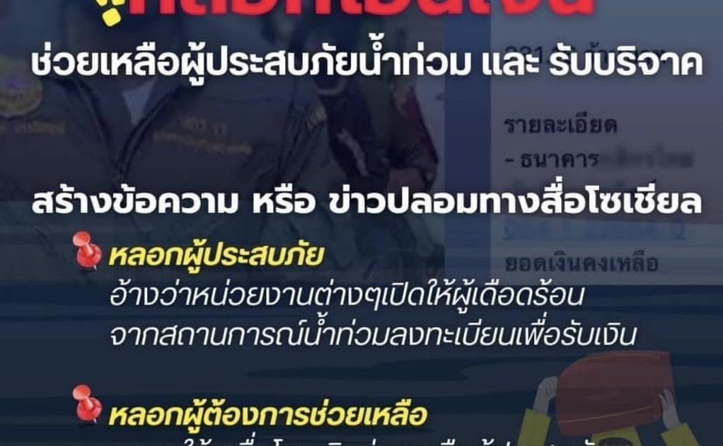 ระวัง! มิจฉาชีพหลอกให้โอนเงินช่วยเหลือผู้ประสบภัยน้ำท่วม