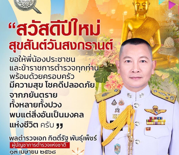 สวัสดีปีใหม่ สุขสันต์วันสงกรานต์ 13 เมษายน 2568 โดย admin / ข่าวประชาสัมพันธ์,ข่าวฝากประชาสัมพันธ์ “ สวัสดีปีใหม่ สุขสันต์วันสงกรานต์ ขอให้พี่น้องประชาชนและข้าราชการตำรวจทุกท่าน พร้อมด้วยครอบครัว มีความสุข โชคดีปลอดภัยจากภยันตรายทั้งหลายทั้งปวง พบแต่สิ่งอันเป็นมงคลแห่งชีวิต ครับ ”พลตำรวจเอก กิตติ์รัฐ พันธุ์เพ็ชร์ผู้บัญชาการตำรวจแห่งชาติ๑๓ เมษายน ๒๕๖๘
