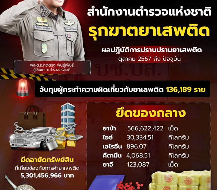 จับกุมผู้กระทำความผิดเกี่ยวกับยาเสพติดได้จำนวนทั้งสิ้น 136,189 ราย